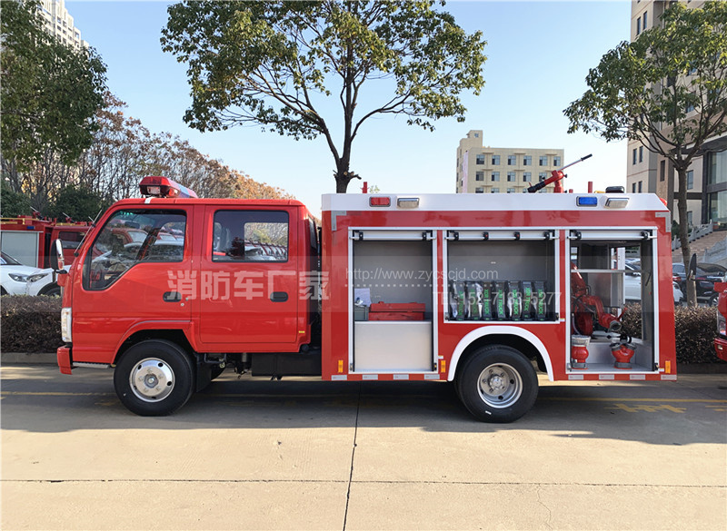 五十鈴3噸水罐消防車,五十鈴120馬力發(fā)動機(jī),底盤型號:QL1070BUKWY,發(fā)動機(jī)型號:4HK1CN6LB,7.00R16輪胎,紅色雙排駕駛室,軸距:3815mm。罐體容積:3噸水,配備上海茸申CB10/20消防泵,成都威斯特PS20消防炮,紅色警燈,整車消防紅。水射程:≥50m。