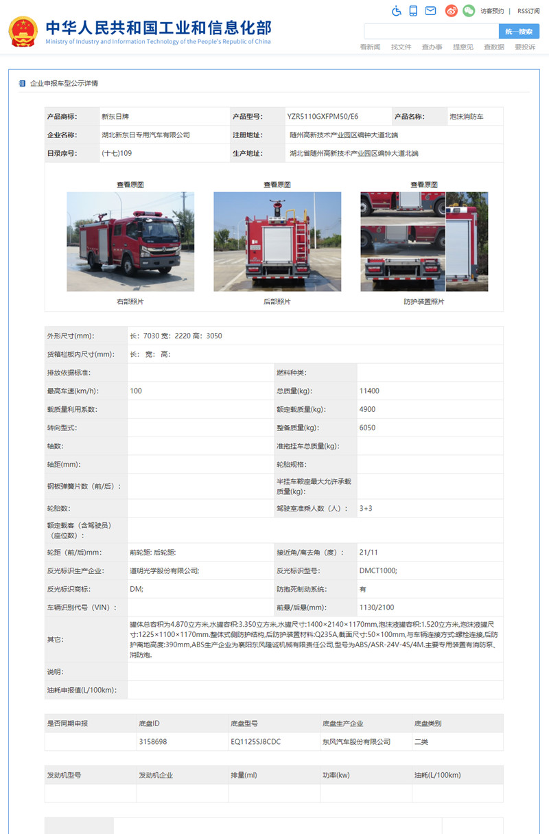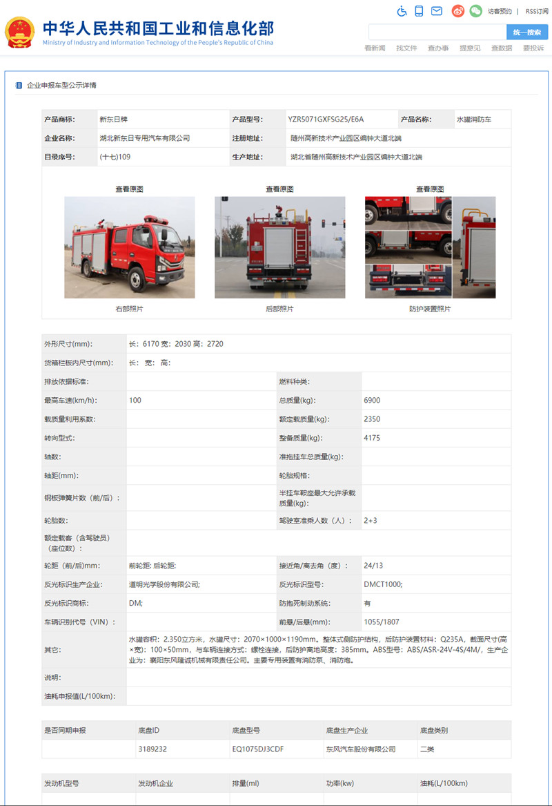 根據《道路機動車輛生產企業及產品公告》管理和《財政部 稅務總局 工業和信息化部 交通運輸部關于節能 新能源車船享受車船稅優惠政策的通知》(財稅〔2018〕74號)的有關要求,現將《道路機動車輛生產企業及產品公告》(第343批)中可以看到,我公司有兩款消防車公告公示,東風2.5噸水罐消防車和東風5噸泡沫消防車。
