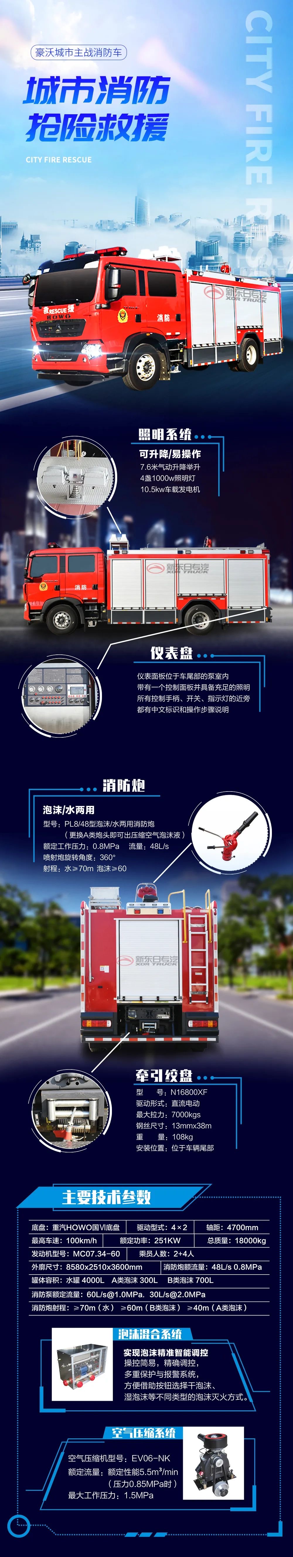 豪沃單橋城市主戰(zhàn)消防車采用中國重汽集團濟南卡車股份有限公司生產的ZZ5207TXFV471GF5型二類汽車底盤, 該車原裝雙排駕駛室,可載含駕駛員在內的乘員6人,駕乘舒適輕便。該車采用DC-CAFS60/45M型集成壓縮空氣泡沫滅火系統(tǒng),該壓縮空氣泡沫系統(tǒng)操控簡易,泡沫生成實現(xiàn)即時全自動微機精確調控,并設多重保護與報警系統(tǒng),消防作戰(zhàn)員可依據復雜的火場情況,方便地借助按鈕選擇干泡沫、濕泡沫等不同類型的泡沫滅火方式。該套系統(tǒng)不僅裝有A類泡沫原液,還裝有B類泡沫原液,可高效率地撲滅和控制A、B類物質火災,并具備良好的環(huán)保性能。另外該車配置有牽引電動絞盤,7.6米氣動升降舉升4*1000w照明燈和10.5kw車載發(fā)電機,使得該車還可獨立開展偵查、破拆、救生、照明、防護等綜合搶險救援功能。